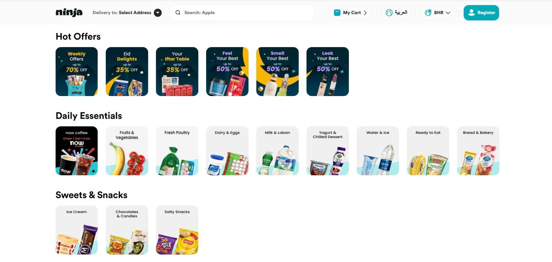 مرحبًا بك في نينجا، المتجر الرقمي الذي لا يغلق أبوابه أبدًا! مفتوح على مدار الساعة، نينجا هو وجهتك الوحيدة لجميع احتياجاتك من المواد الغذائية. من الخضروات والفواكه الطازجة إلى مكونات العشاء، نحن هنا لنلبي كل احتياجاتك. اختبر راحة التسوق عبر الإنترنت بسلاسة مع نينجا، حيث كل ما تحتاجه على بعد نقرة واحدة. تسوق في أي وقت وفي أي مكان، واسمح لنينجا بتسهيل تجربة التسوق للمواد الغذائية بالنسبة لك.