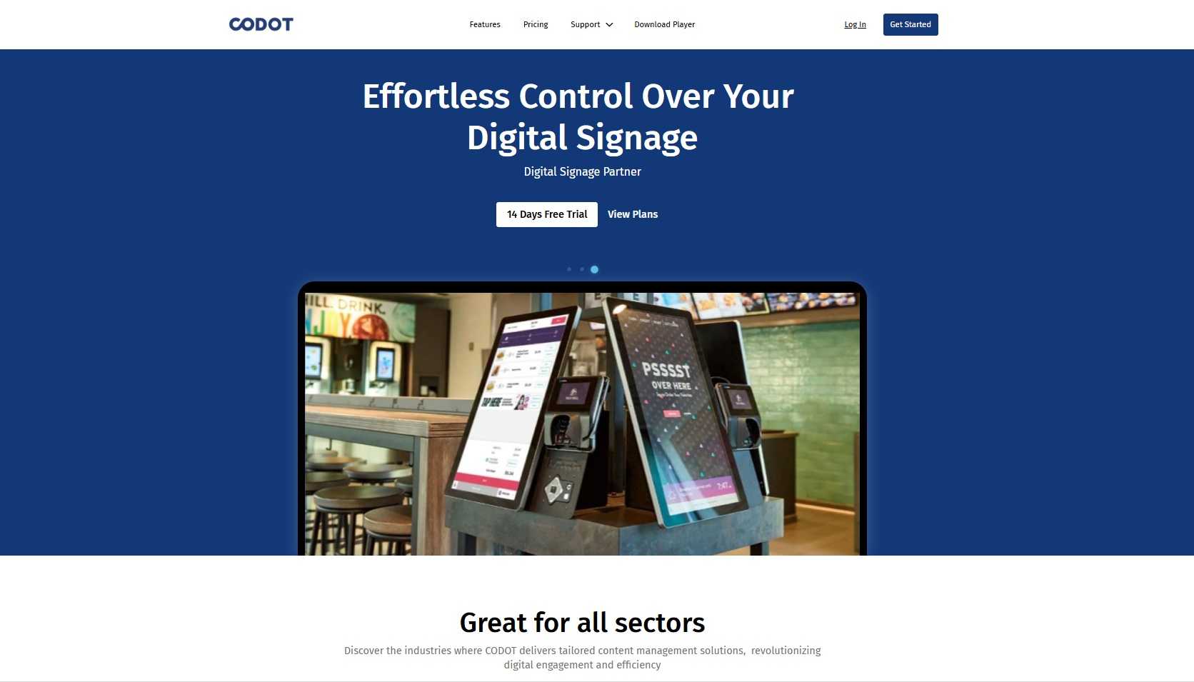 CODOT هي منصة SaaS احترافية للإشارات الرقمية، تُمكّنك من إنشاء وإدارة وعرض المحتوى عبر الشاشات حول العالم. إنها مثالية للشركات في مجالات الإعلان، وتجارة التجزئة، والمأكولات والمشروبات، والضيافة، وغيرها. CODOT مُصممة خصيصًا لكل من يرغب في عرض محتوى مميز على الشاشات؛ سواءً كنت شركة إعلانات رقمية، أو مطعمًا، أو متجرًا، أو مكتبًا مؤسسيًا.