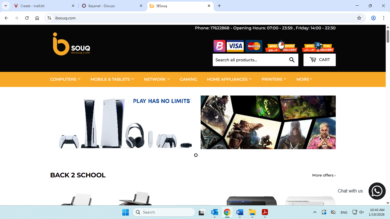 IBSouq هي علامة تجارية لشركة Intelligent Business Solutions (IBS)، وهي شركة متخصصة في بيع أجهزة الكمبيوتر والهواتف المحمولة والإلكترونيات وملحقاتها. تأسست الشركة في عام 2020 كجزء من هدف IBS المتمثل في استهداف الأفراد والشركات من خلال توفير أجهزة إلكترونية عالية الجودة وبأفضل الأسعار في السوق. يقع مكتب IBSouq في قلب مملكة البحرين، مع توفير خدمة توصيل مجانية لجميع أنواع الطلبات التي يتم إجراؤها عبر الموقع الإلكتروني. تشمل منتجات IBSouq: أجهزة الكمبيوتر المكتبية، وأجهزة الكمبيوتر المحمولة، وأحبار الطابعات (التونر والخراطيش)، والهواتف المحمولة، وأجهزة الشحن، والإكسسوارات. كما توسعنا أيضًا لتقديم خدمات ميدانية مثل: تثبيت البرامج، وصيانة أجهزة الكمبيوتر والطابعات، وتوسيع نطاق شبكة الواي فاي، وغيرها.