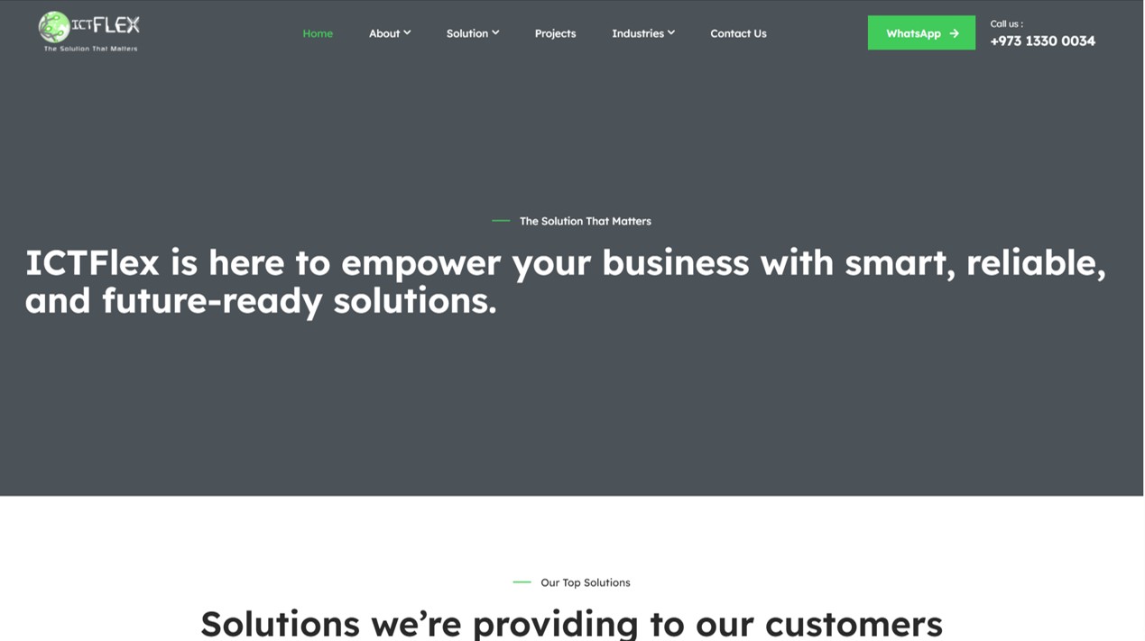 ICTFlex W.L.L. هي شركة بحرينية متخصّصة في تكنولوجيا المعلومات والاتصالات (ICT) تقدم حلولًا تقنية متقدمة تلبي احتياجات المؤسسات الحكومية والتجارية في التحول الرقمي. تشمل خدماتها حلول التحول الرقمي الشاملة، أنظمة إدارة الصفوف الذكية، نظم إدارة الطوابير، حلول تحديد وتتبع الأصول بتقنية RFID، وأنظمة سحابة لإدارة الموارد البشرية، بالإضافة إلى حلول مبتكرة في أنظمة مواقف السيارات والتحكم بالدخول. تسعى ICTFlex لتمكين عملائها من تعزيز كفاءتهم التشغيلية وتحسين تجارب المستخدمين من خلال دمج التكنولوجيا المتطورة والخبرة العملية في مشاريعها المختلفة.